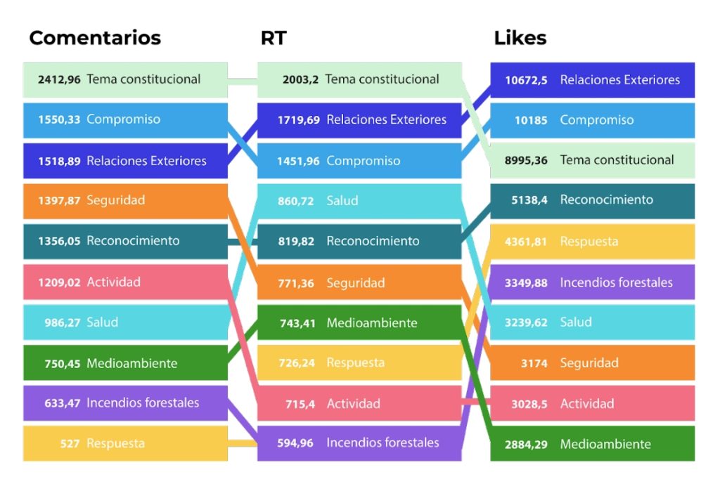 Las menciones originales fueron 696 en total (no se consideraron los retweets). Cada una de ellas fue categorizada según la materia y, a su vez, fueron observadas para obtener información cualitativa y cuantitativa. Así, se detectaron 41 temáticas, siendo 20 de estas más constantes o activas en comparación al resto.